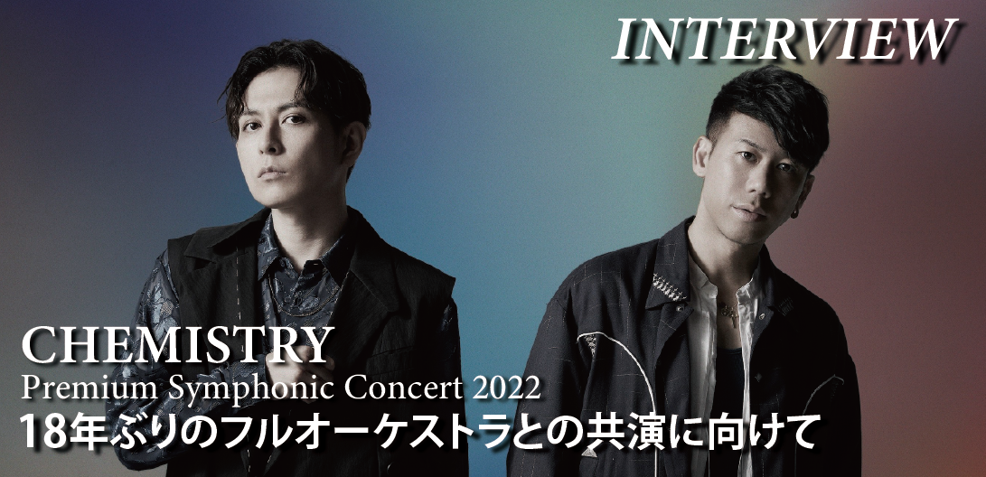 2021年に20周年を迎えたCHEMISTRYが、2004年に行なった【CHEMISTRY in SUNTORY HALL~響~】以来、18年ぶりのフルオーケストラコンサート【CHEMISTRY Premium Symphonic Concert 2022】を7月27日に東京・東京文化会館、8月7日に大阪・フェスティバルホールで開催する。久々のフルオーケストラとの共演に、「どうなるか想像がつかない分、今からワクワクしています」(堂珍)、「あの独特の緊張感を皆さんと一緒に楽しみたいと思います」(川畑)と語っている二人と、栗田博文指揮の東京フィルハーモニー交響楽団、大阪交響楽団、そしてピアノの渡辺シュンスケとの“化学反応(CHEMISTRY)”の先にある、深い“響き”が楽しめそうだ。二人にインタビューし、意気込みを聞いた。