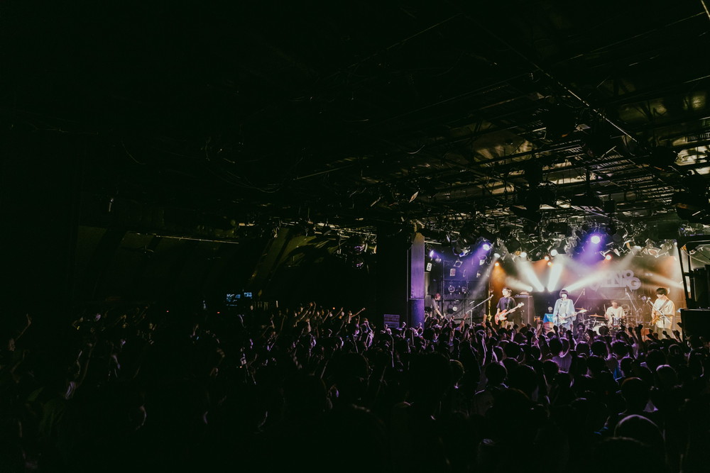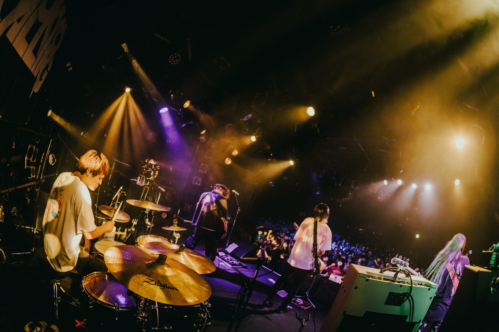 早弾きのギター・ソロもあった「2001」のあとは、「夏の新曲やります」と8月にリリースしたばかりの「夏の迷惑」を披露。さらに、ドラムのフィルインで空気を変えると、温かいムードの「バイマイフレンド」へ。ボーカル、ギター、ベース、ドラムだけではなく観客の手拍子も一緒になり楽曲が形作られていくなか、「優勝」と満足気な笑みを浮かべる4人。幸福感はそのままにテンポアップとともにメロコア風になるアウトロを爆走すると、ラストは「愛すべきミュージック」。えいが「今日をきっかけにまたみなさんと会えますように」という言葉とともに<悲しい時に歌え 君が信じてる愛すべきミュージック/眠れない夜に1人きりにはさせない>と歌う同曲を届け、リスナーとの絆を結んだ。