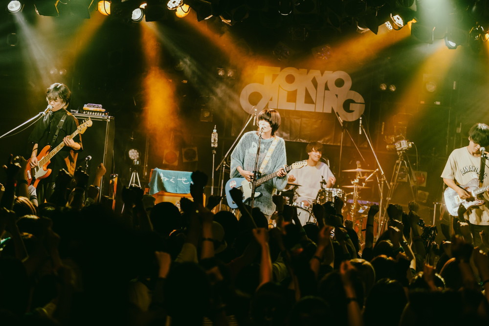13のライブハウスのうち、渋谷CLUB QUATTROのトリを務めたのは、名古屋発の4ピース・バンド、ねぐせ。だ。2020年8月に結成、コロナ禍でも配信リリースやSNSなどを通じて楽曲が広く認知されたバンドで、今年の夏は大型フェスにも複数出演。満員の観客が手拍子し、歓迎ムードでメンバーを迎えた。「宇宙で一番あったかい音楽を鳴らしに来ました。未来に乾杯しよう!」と最初に演奏したのは「片手にビール」。挨拶代わりの1曲目を終え、続いては「グッドな音楽を」。ビール・ジョッキを掲げるように拳を上げたり、T. Rexオマージュのギターリフに身体を揺らしたりしている観客の姿から、楽曲が十分に浸透していることが窺える。バンドの調子もばっちりのようで、ステージから何度も「最高!」という声が聞こえてきた。2年連続の【TOKYO CALLING】出演、そして今年はトリということで、MCではりょたち(Gt/Vo)が「すごく重要なところにブッキングしていただきました。ありがとうございます!」と語った。