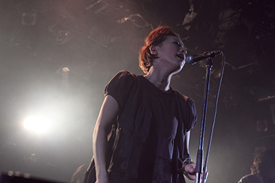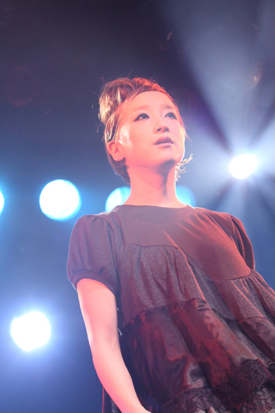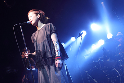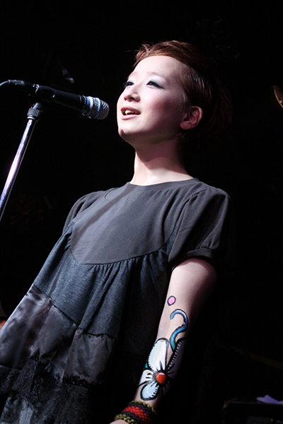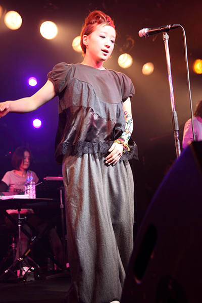 ハッピーグルーヴ全開のバンドサウンドとハンドクラップに、スキップをしながら笑顔でステージに現れたたむらぱん。いきなり最新シングルから『ちょうどいいとこにいたい』をマイクスタンドの前で揺れながら歌い出し、そのよく伸びるハイトーンボイスをぐいんぐいんぶっ飛ばしていく。「さぁとうとう来ました。今日はみんなしあわせになりに来たんですよね?じゃあ一緒にしあわせになりましょう!」のっけからとにかく気持ちが乗りまくりの、飛ばしまくりで、途中「最後まで持つか分からない」と自分でも言っていたが(笑)とにかく動き回りながら、体のすべてで、気持ちのすべてで、どんどんエモーショナルになっていくバンドサウンドと共にあちらこちらへと突き抜けていく彼女の声。『ライ・クア・バード』なんて、ほんと気持ち良く大空を駆け巡ってたし、駆け巡れたし。