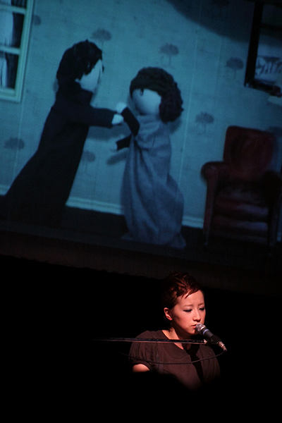 「天下のブックオフの上でライブをやらせて頂くなんて」と、毎日100円コーナーで1冊ずつ本を買ってるお店の入ったビルで歌える喜びを語るたむらぱん。どさくさに紛れて「『ブックオフのテーマソング』を作らせてもらえないかしら?」なんて言ったりしちゃいつつ(笑)そんな自由奔放な彼女の一面を凝縮した『ハリウッド』に、みんな幸せ気分でハンドクラップを合わせたりしながら、揺れている。ちなみに今日のクアトロにはふたつのステージがセットされており、ライブ中盤になって彼女は入口から見て右サイドに設置されているピアノのもとへ。そして映像と共にたむらぱんが歌うという、しかもその映像が今日以降公開予定のないというプレミアステージで、彼女は『キースとモモ』を弾き語りで披露した。歌だけでも十分に切ない別れの曲なのに、映像でそれが表現されると、もはや涙を堪えるのは不可能。そこへ畳み掛けるように披露される、名曲『カントリーロード』。しかも映画「耳をすませば」でも使用された日本語詞バージョン。帰りたい、帰れない、さよなら、カントリーロード……気持ちの入ったピアノと声で聴かせてくれたこの曲も大いにこちらの涙腺を緩めてくれた。