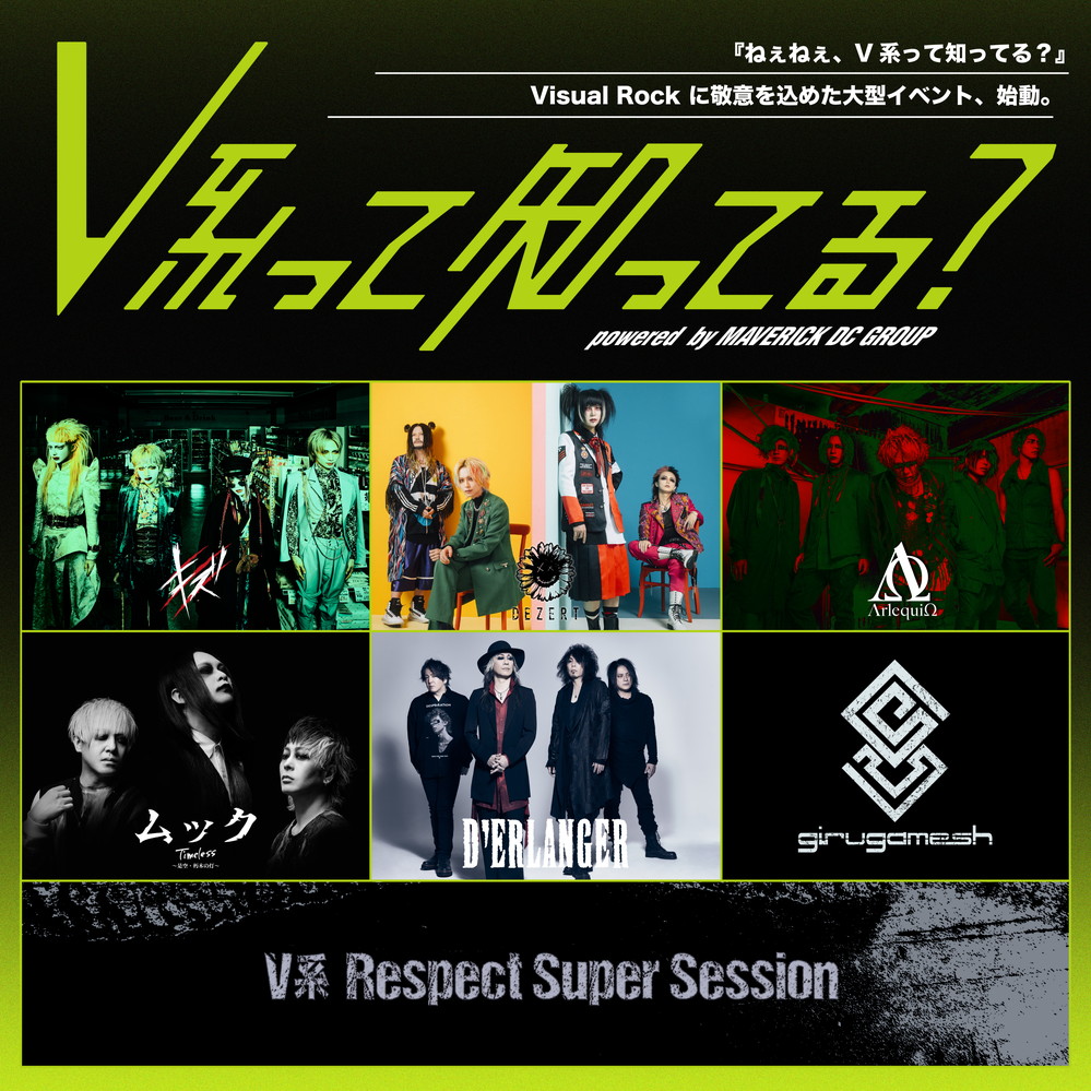 出演アーティストは、DEZERT、キズ、アルルカン、ムック(※)、D’ERLANGER、girugamesh、そしてV系Respect Super Session。V系シーンの次世代を担う3組に加え、結成25周年を迎えたMUCC、再結成15周年を迎えたD’ERLANGER、このイベントで復活を果たすgirugameshが出演し、さらにはこの日限りのスペシャルな企画としてV系Respect Super Sessionが行われる。