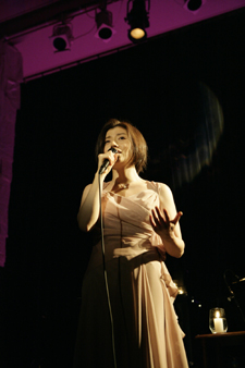 「改めまして、こんばんは、柴田淳です。なんか、胸いっぱいで・・・真っ白になってしまいました。こういうライブは2年半ぶり。今日はこういう場を設けていただいて、幸せだなと思っています」と、今日この瞬間をしみじみと噛み締める彼女。そんなしばじゅんの頭上におぼろげに三日月が浮かび上がると、彼女は静かに、そして熱っぽく新曲『紅蓮の月』を歌い始めた。先のMCではアットホームな空気を生み出していた彼女だが、この曲では悲しみがこの世界を染め上げていた。それにしても歌っているときと喋っているときのギャップの大きさは相変わらず(笑)。彼女が歌っている最中は感動の面持ちのファンが、MCに入ると、大爆笑したり、緊張している様子のしばじゅんを「頑張って」と応援したり、まるで友達のようになっている。これもまたしばじゅんのライブの醍醐味と言える。