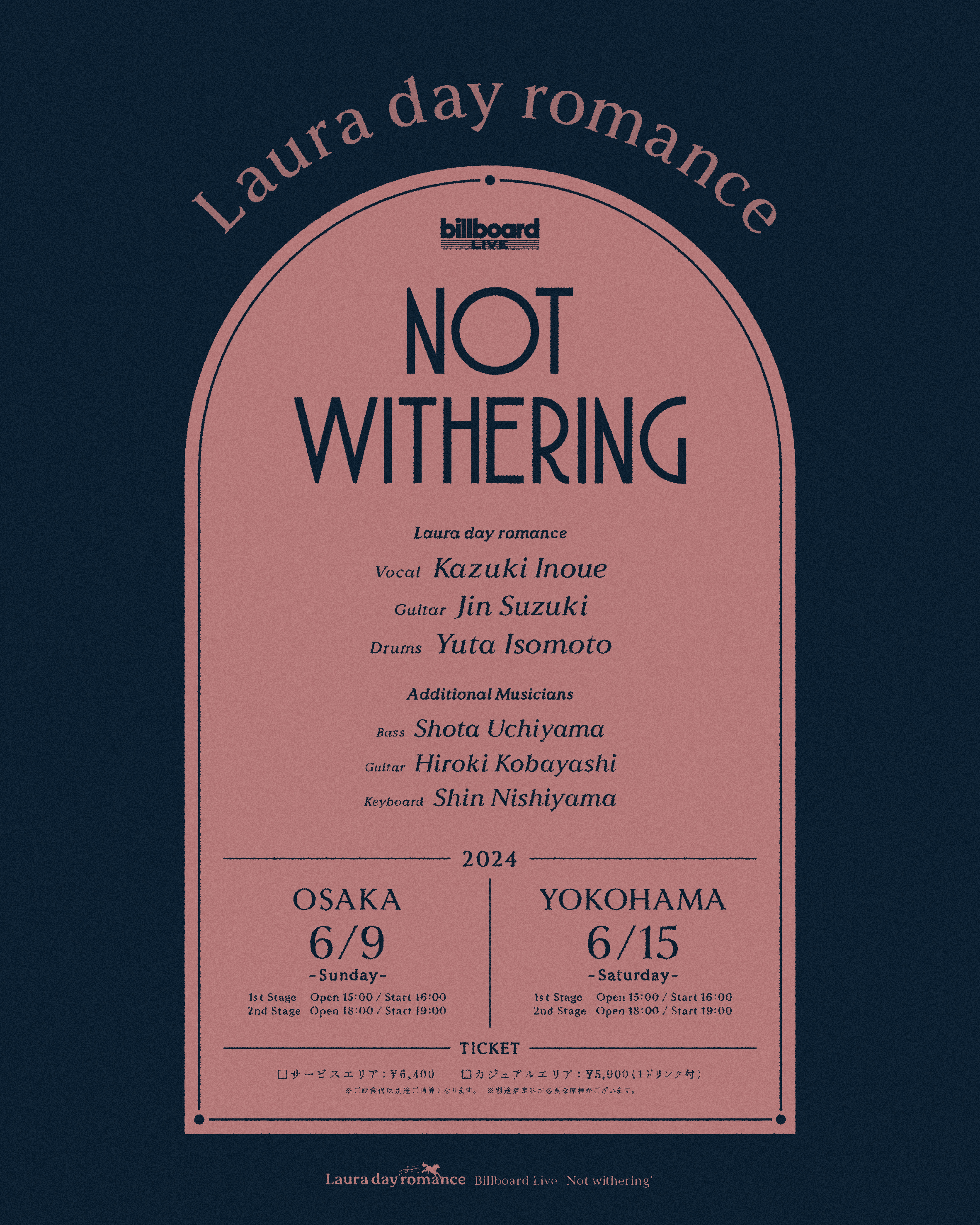 Laura day romanceが6月9日にビルボードライブ大阪、6月15日にビルボードライブ横浜でワンマンライブ【Not withering】を開催する。2023年にメンバーの脱退やマネジメントの変更を経験し、井上花月(ボーカル)、鈴木迅(ギター)、礒本雄太(ドラム)の3人で再スタートを切ったローラズ。1月に発表された『Young life / brighter brighter』と、4月に発表された『透明 / リグレットベイビーズ』という2作のデジタル・シングルは、バンドの転換期に感じた諦念を背景に漂わせながら、それを受け入れることで執着を手放し、心軽やかに前へ進んでいこうとする現在の3人の姿とリンクする珠玉の楽曲たちだ。インディロック好きなら誰しもが愛さずにはいられないローラズの音楽が、初のビルボードライブ公演でどのような進化・深化を遂げるのか、見逃せない一日になるだろう。(Text:金子厚武 / Photo:日吉"JP"純平)