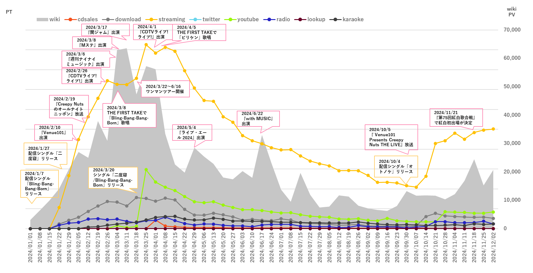 では、「令和トレンドセッター層」に代表されるような、音楽の楽しみ方や広め方、生み出されるフィードコンテンツが、どのような音楽ヒットを後押ししたのか。12/25公開時点の“JAPAN Hot 100”で、「オトノケ」が4位、「Bling-Bang-Bang-Born」が7位と、2曲がTop10圏内の「Creepy Nuts」と、「Bunny Girl」が8位で急上昇中の「AKASAKI」に注目し、 Billboard Japan CHART Insightデータも活用して考察していきたいと思う。