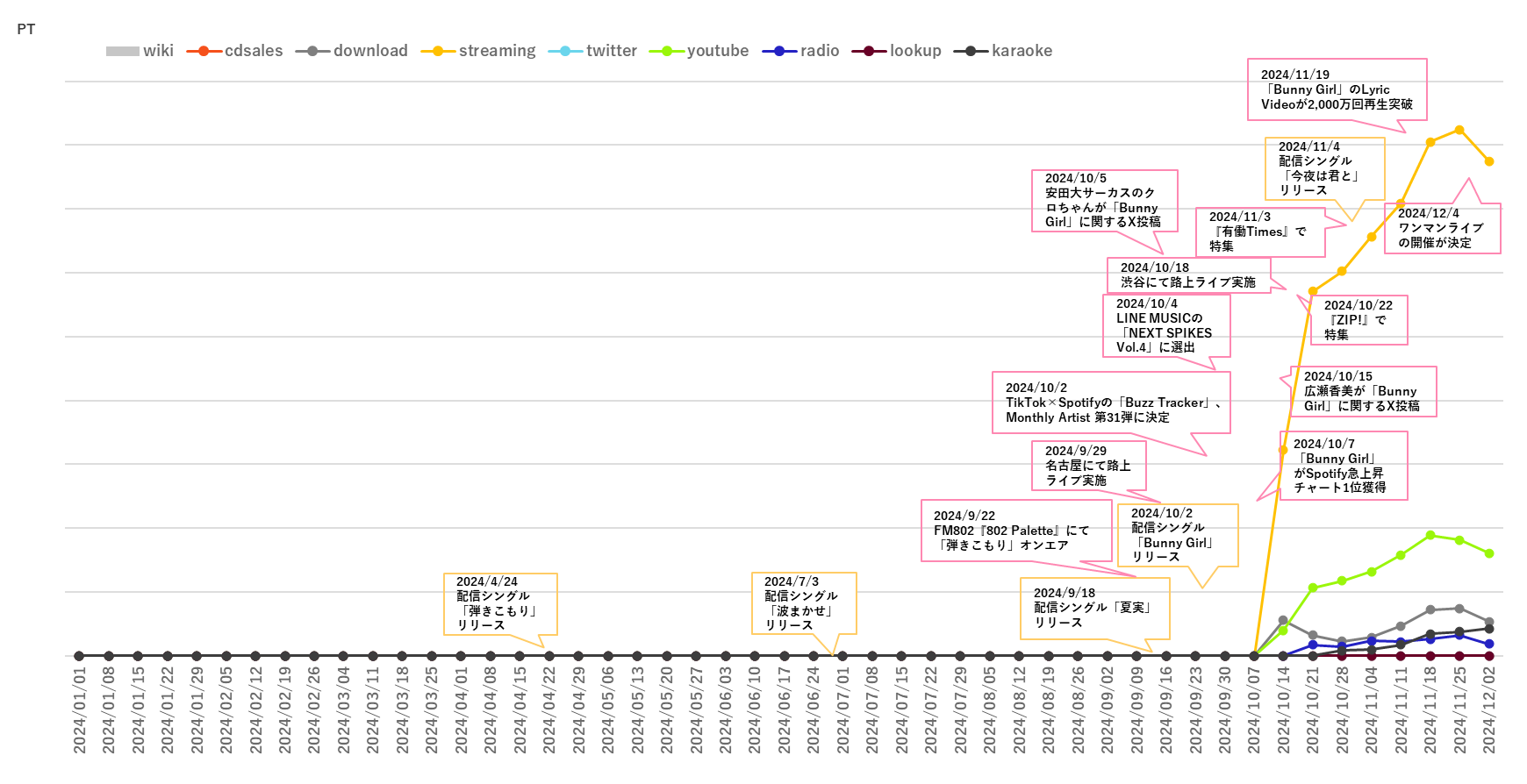 そして、彼の名前が特に広く世に名前が知られることになったのは同年リリースの「Bunny Girl」のヒットによるもの。2024年7月に自室で、新曲として一部を演奏している動画をTikTokに投稿したところすぐさまこの曲がトレンドになり、フルバージョンを聴きたいという声も次々と寄せられることになった。10月に満を持して同曲をリリースすると、勢いはそのままに、2024年10月16日公開の“JAPAN Hot 100”でもTop10入りを果たした。