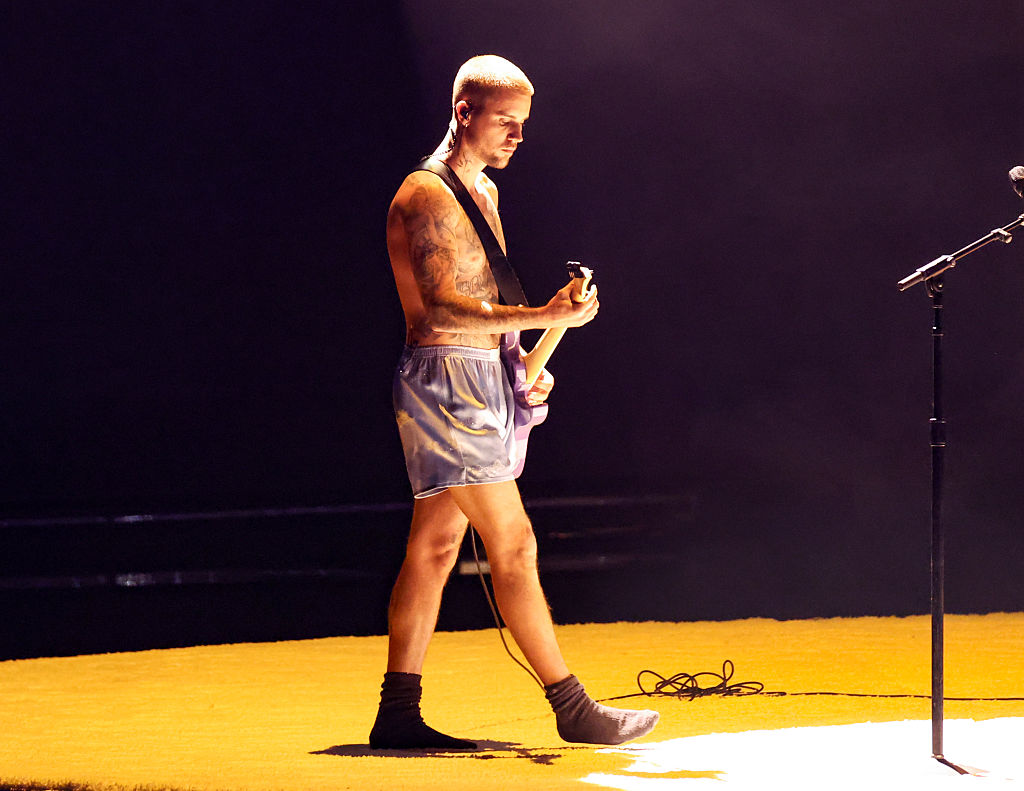 31歳ながらキャリア15年以上のジャスティン・ビーバーは、15年前に同賞にノミネートされた経験を持つ。実に4年ぶりのテレビパフォーマンスとなったこの日、ボクサーパンツに靴下だけという驚きの姿で登場した(イヤモニには自身のアパレルブランド「Skylrk」のロゴを入れて、ちゃっかりアピール)。前回歌った「Peaches」は妻ヘイリーに捧げた曲だったが、今回も彼女にしか眼中にないと言わんばかりの「YUKON」を、観客はまるで彼の自宅を覗いているような、必要なものだけを残したミニマルな編成で届けた。