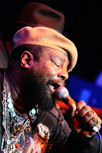 そのグルーヴに乗って、ジョージ・クリントン総帥がふらりとステージに登場。トレード・マークだったレインボー・カラーのドレッドではなく普通の(!?)ヘアスタイルに変身してきたことに驚かされながらも、迷彩柄のパンツと装飾だらけのジャケットでの登場は、まさに総帥の貫録。