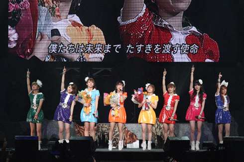 また『雨の降らない星では愛せないだろう?』をこの日最大のエモーションで聴かせると、高橋が「3人の想いを受け継いでこれからモーニング娘。はどんどん進化したいと思います」と宣言。ラストは「みんなで一緒に悔いが残らないぐらい、大きな声で歌いましょう」と『涙ッチ』を、8人とも顔をしわくちゃにして熱唱します。全てを歌い終えた彼女たちは「どうもありがとうございました! モーニング娘。でした!!」と大声で挨拶。メンバーが次々と袖に消えていく中、ステージに残った亀井は「亀井絵里、完全燃焼しましたー!!」と満面の笑みを浮かべました。