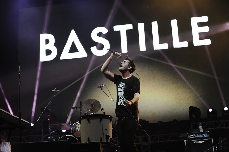 デヴィッド・リンチの名作『Lost Highway』にインスパイアされたデビュー・アルバム『Bad Blood』のアートワークのバックドロップを背に、これまたデヴィッド・リンチの顔がプリントされたTシャツを纏ったダン・スミス率いるバスティルのメンバー4人がステージに登場。映画『The Breakfast Club』の台詞とともにアルバムのタイトル・トラック「Bad Blood」でライブがスタート。