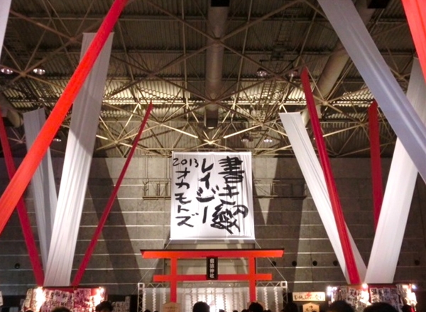 ほかにも、会場の真ん中の広場では、これも出演者が参加しての「餅つき大会」が開かれたり、物販ブースなどが集まる建屋では「音波神社」と銘打たれた鳥居があり、正面には「書き納めレイジー」と書かれた巨大な半紙。毎年、出演バンドが手がけるのが恒例で、今年はOKAMOTO'Sが書いていた。