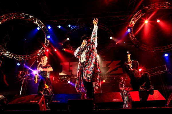 白いスーツを身にまとったメンバー一同がステージに登場するや否や、25周年スペシャルソング第一弾の「閃光」にはじまり、「太陽にお願い」などスカパラオリジナルソングを立て続けに4曲聴かせ、会場をとことん盛り上げる。続いて、今回のイベントRADIO CRAZYのキャラクター“CRAZYMAN”のために制作された「CRAZYMANのテーマ」が披露されると、そのFunkyな楽曲にオーディエンスからもつい笑顔が溢れる。