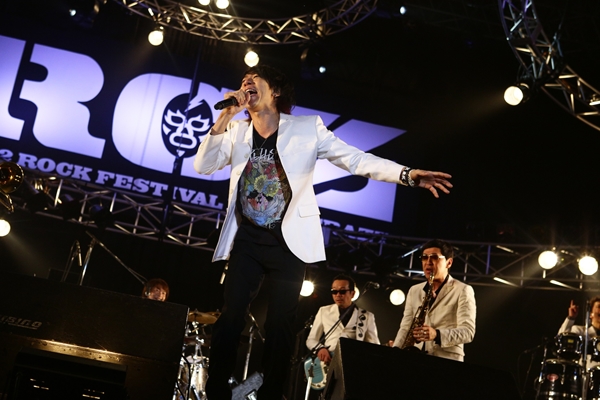 そしてこれも豪華なコラボレートとなったのが、R-STAGEの東京スカパラダイスオーケストラ。ふらりと現れた茂木欣一がひとりでドラムを叩き始め、徐々にメンバーが増え、最後にホーン隊が揃うという粋なオープニングから、アッパーなナンバーを続けざまに繰り出した序盤を経て、このフェスのテーマ曲ともいえる「BAT MANのテーマ」の改題曲「CRAZY MANのテーマ」をカバーしてみせると、ジングルが鳴り響き、ステージには「ON AIR」のライトが点灯、茂木にスポットライトが当てられた。茂木が以前担当していたラジオ番組「JUSTA RADIO」を模したコーナーの始まりだ。