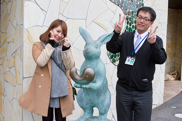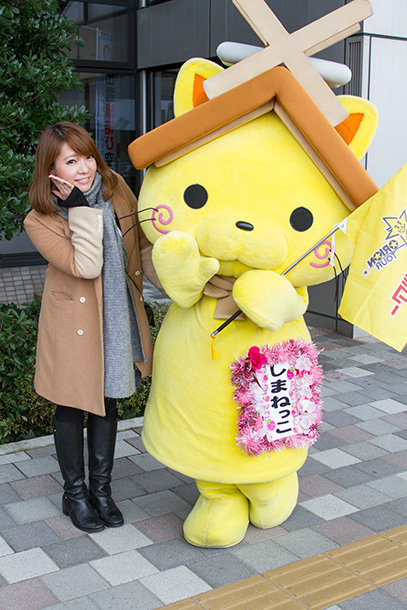 3月1日正午、東京は羽田から1時間半ほど。“出雲縁結び空港”の愛称でも知られる出雲空港へ到着すると、島根県観光キャラクター しまねっこが参加者たちをお出迎えだ。愛らしいデザインは女性からの人気が高く、曽根も気に入った様子でさっそく記念撮影。