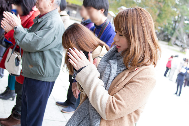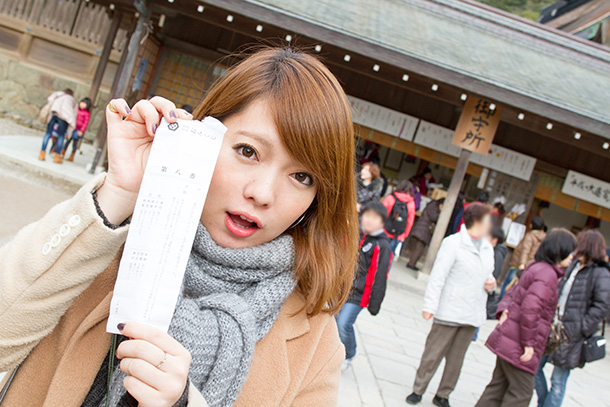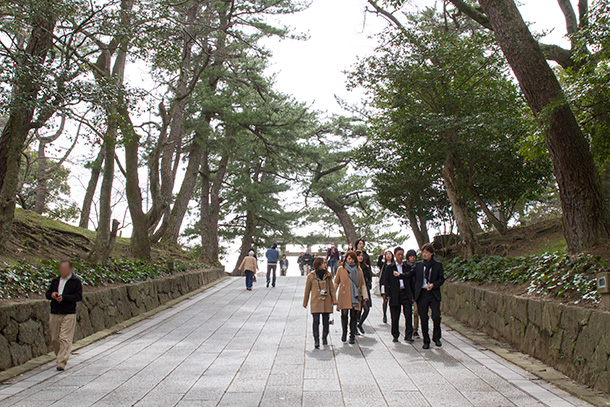 今回が島根初上陸という曽根だけに、出雲大社を訪れるのも当然初めて。神楽殿に張られた長さ13メートル、太さ最大8メートル、重さ4.5トンと日本最大級の注連縄に感嘆の声を上げると、参加者たちと共に神楽殿へ昇殿して玉串奉納を。そして巫女舞の鑑賞後、御神酒と肌守りを授かって戻ってきた彼女は、どこか神妙な面持ちである。