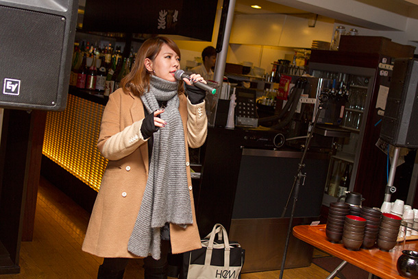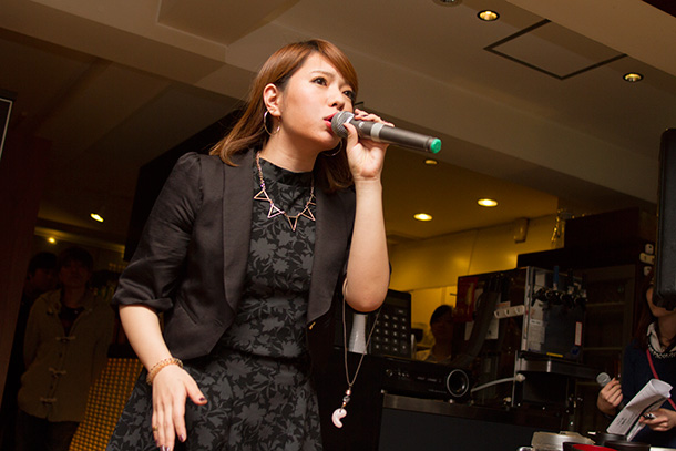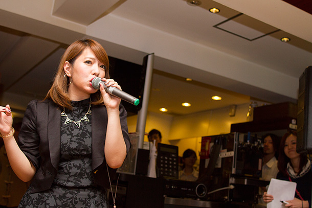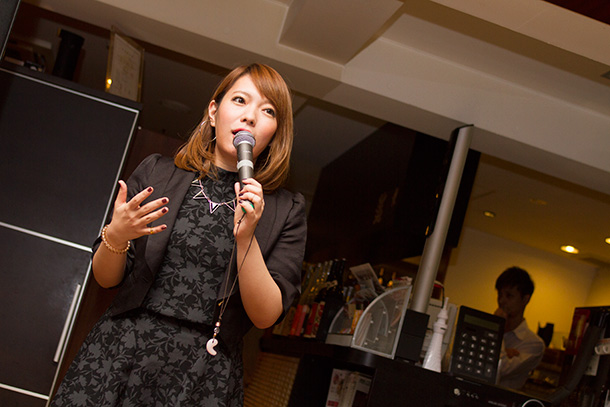 そして本番、計70名ほどの参加者たちの前に登場した彼女は、会場に漂う緊張感を軽やかなトークでほぐしていきながら、「瞳にキスを」を笑顔で熱唱。最後は乾杯の音頭まで行い、会場にリラックスした雰囲気を届けた。