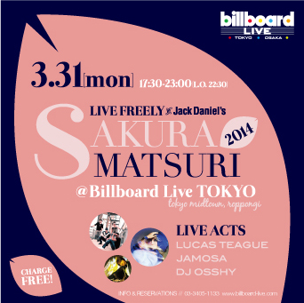 ビルボードライブ東京が一晩限定でエントランス・フリーのミュージック・ラウンジと化すイベント【Live Freely by Jack Daniel's】。3月は"SAKURA MATSURI 2014"をテーマに、お花見パーティーを開催します。いつものビルボードライブ東京の会場に桜の花やお座敷シートが登場し、お花見会場に大変身!ライブアクトは、カナダ出身の男性新人ヴォーカル・グループ ルーカス・ティーグ。2014年1月に日本デビューしたばかりの彼らが、「さくら」などJ-POPカヴァーによる初ライブを披露します。ゲスト・パフォーマーには人気R&B歌手JAMOSA、さらにDJにはおなじみOSSHYが登場。室内で楽しめる大人のためのお花見パーティーをお楽しみに!
