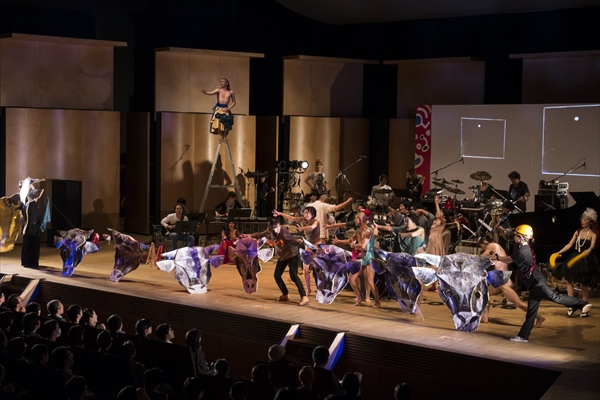 LFJの多彩なプログラムの中でもひときわ異彩を放っていたのが脱ジャンル音楽パフォーマンス集団、渋さ知らズ オーケストラだ。玄界灘渡部が「ジャズから始まり、Jロック、クラシックと、またCDの売上の低いゾーンへと戻ってきましたー!」と挨拶をぶちかますと、モーツァルトのトルコ行進曲や、ブラームスのハンガリー舞曲に合わせてダンサー達が踊り狂う。数時間前には、協奏曲やコンサートの公演が繰り広げられていたのと同じ会場とは思えないカオスぶり。後半のラヴェル「ボレロ」では巨大な銀色の龍が客席の空中を練り歩くなど、観客の度肝を抜き続けた。