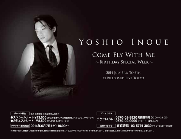 2000年にミュージカル「エリザベート」のルドルフ役でデビュー以降、ミュージカル俳優、歌手、役者など幅広く活躍する井上芳雄。2014年7月にビルボードライブ東京で開催される『井上芳雄 -Come Fly With Me -Birthday Special Week』を目前に控え、コンサートへの想いについてインタビューを行った。