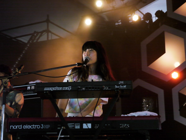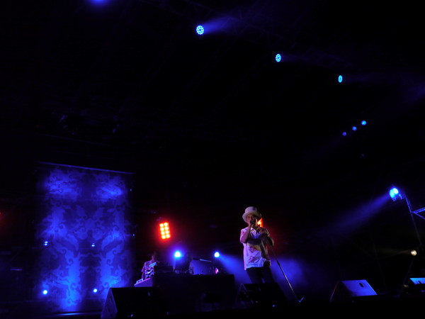 <EAETHTENT>には、今凄まじい勢いで音楽シーンを爆進するゲスの極み乙女。がトップバッターとして登場。開始前にも関わらず、会場から溢れかえったオーディエンスたちはリハーサルの段階でボルテージMAXといった模様。幕開けの「パラレルスペック」が鳴り出せば、会場は魅惑のダンス・ホールへと早変わり。4人の確かな演奏技術が光るセンセーショナルなグルーヴに、シニカルでユーモアの効いたラップが乗っかり、ダンサブルで、それでいて心地の良いサウンドが会場中を躍らせてみせる。MCでは、お馴染みである、ちゃんMARIとオーディエンスとのコール&レスポンス、休日課長へ対する、ほな・いこかの毒舌が炸裂。そんな自由なMCを川谷絵音が冷静にまとめ上げる。彼ら独特のテンポで進行していくステージがさらにオーディエンスを惹きつけていくのであろう。ラストには、彼らを一躍トップシーンへと押し上げた鉄板ダンス・チューン「キラーボール」を投下し、詰めかけた全オーディエンスを魅了していた。